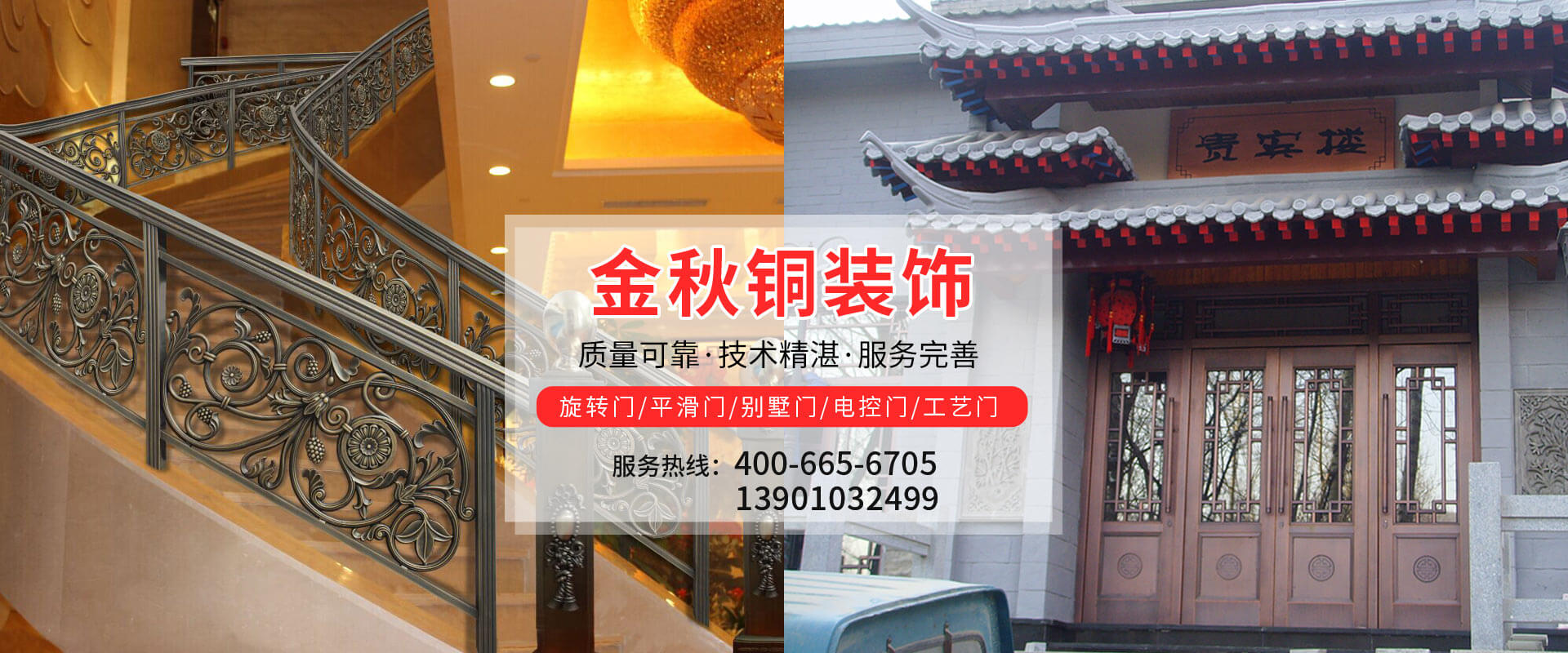 北京金秋銅裝飾材料有限公司是專業生產銅裝飾材料及設計、開發(fā)、制造、施工、售后服務為一體的大型綜合企業。可承接建筑銅裝飾工程及五星級酒店、別墅、博物館、樓樘管所等高檔銅裝飾項目;生產各種規(guī)格的旋轉門、平滑門、別墅門、電控門、工藝門、旋轉護欄、屋頂銅飾防水瓦、浮雕壁畫......